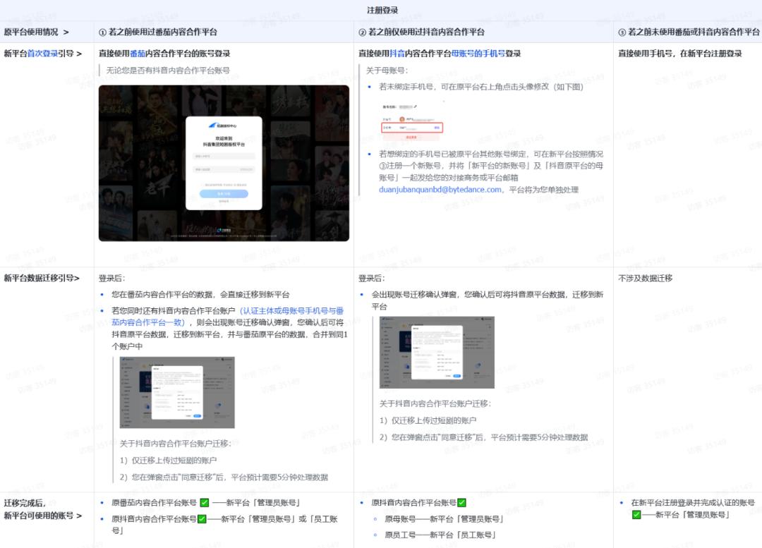 “短剧版权中心(新平台)”将融合“番茄内容合作平台”及“抖音内容合作平台”(原平台)的短剧合作能力,原平台的短剧数据(包含账号、短剧内容等)都将迁移至新平台。