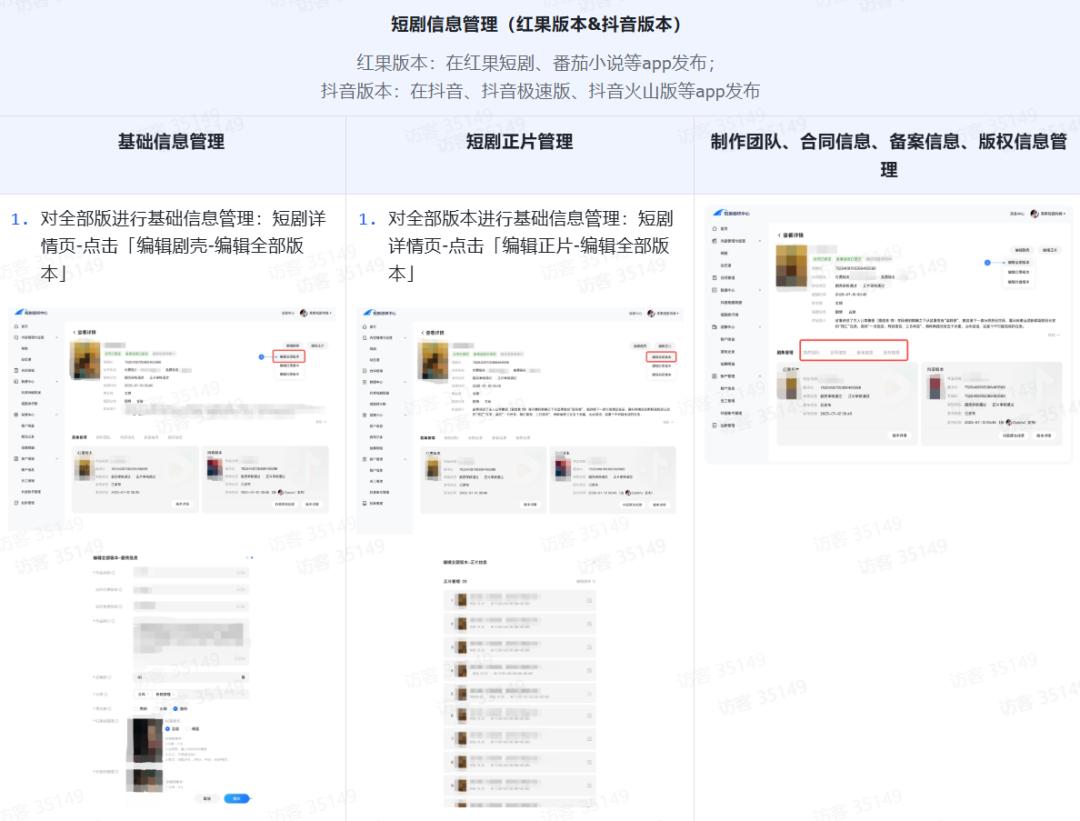 短剧分为红果版本与抖音版权,其中红果版本在红果短剧、番茄小说等APP发布,抖音版本在抖音、抖音极速版、抖音火山版等APP发布。合作方可在后台对两个版本进行基础信息管理与正片管理。