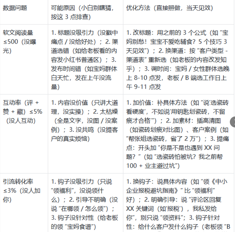 不做数据复盘,重复踩坑:错→发完不看数据,继续瞎写;对→每篇记录阅读量 / 互动率 / 转化率,分析优化。