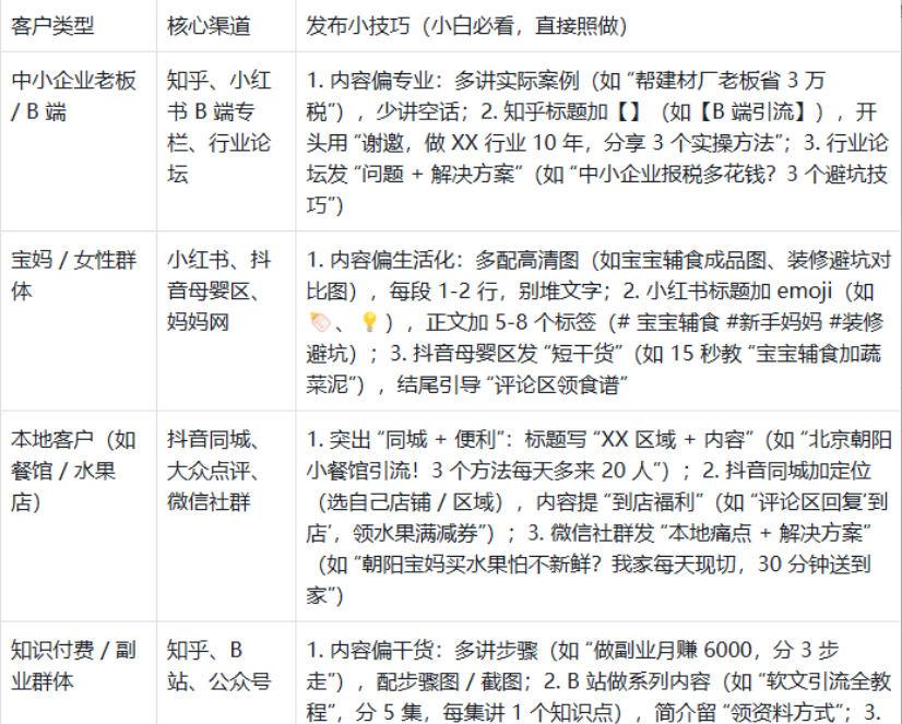 选题太泛,客户不感兴趣:错→做餐饮引流,选题《引流技巧大全》;对→聚焦《小餐馆同城引流技巧》。