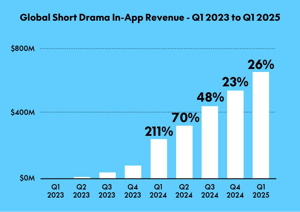 过去两年,短剧出海浪潮席卷全球:短剧类App的全球内购收入在2025年一季度达到近7亿美元,为2024年第一季度的近4倍。