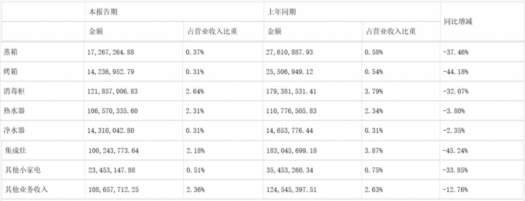 二代任富佳接班后力推的第二品类(一体机、蒸箱、烤箱)与第三品类(洗碗机、净水器、热水器、集成灶、橱柜),在2025年上半年业绩中表现惨淡。除一体机外,其余品类营收全面下滑,其中烤箱与集成灶跌幅更超过44%,令人忧心。