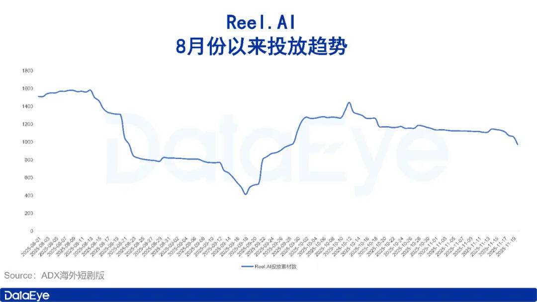 ADX海外短剧版数据显示,8月初至9月中旬,Reel.AI投放素材量由1500组左右逐步下滑,至9月中旬达最低点,日投放素材量仅400组左右;而后再度上升至10月初达1200组左右,10月下旬至今,多维持在1100组左右。