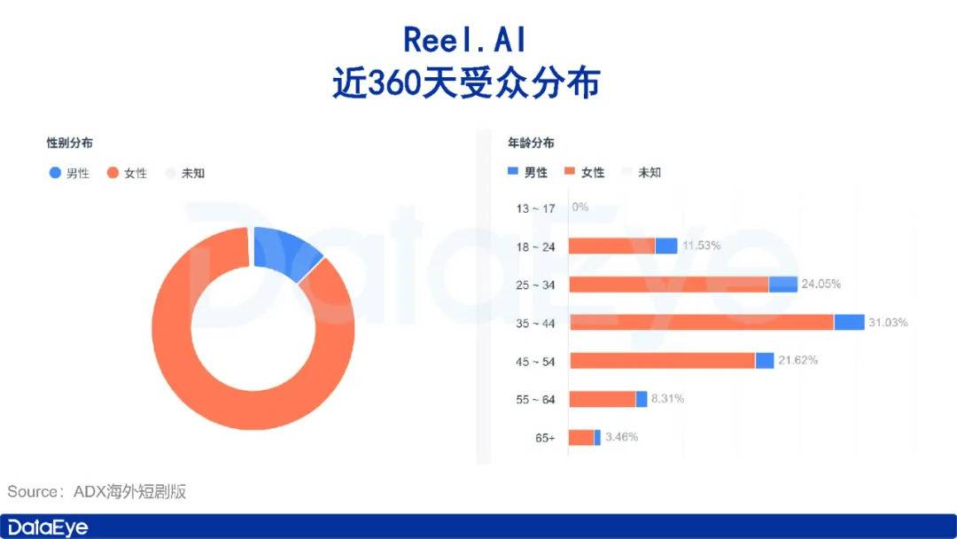 从受众分布来看,近360天Reel.AI以女性用户为主,占比86.73%,男性用户占比12.47%。从年龄分布来看,中青年用户为其主要受众,其中35-44岁用户占比最高,达31.03%,25-34岁其次,占比24.05%,45-54岁用户占比21.62%。