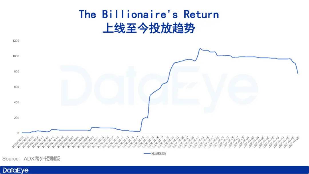 在投流方面,ADX海外短剧版数据显示,《The Billionaire's Return》上线初期投放力度较低,日投放素材量仅有两位数,自9月下旬起正式开始加大投放力度,至10月中旬达最高点约1100组,而后稍有下滑,日投放素材量稳定在1000组左右,近几日再度下滑,至11月20日素材量约800组。