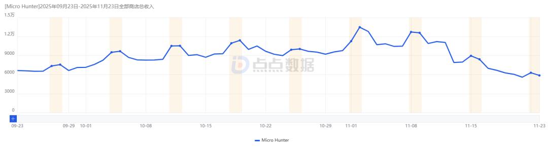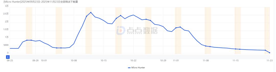 《Micro Hunter》更名以来双端累计预估收入呈现缓慢上涨的趋势。截至11月23日,《Micro Hunter》双端累计预估收入约为55万美元,单日预估收入峰值出现在11月2日,约为1.3万美元。