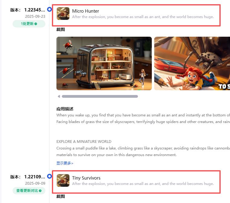 点点数据显示,《Micro Hunter》前身为《Tiny Survivors》,并在今年2月就已经在菲律宾、西班牙、德国、美国、墨西哥、巴西开启小规模测试。直到9月23日才正式更名为《Micro Hunter》,并以《Micro Hunter》继续在部分市场上架及进行效果广告投放。