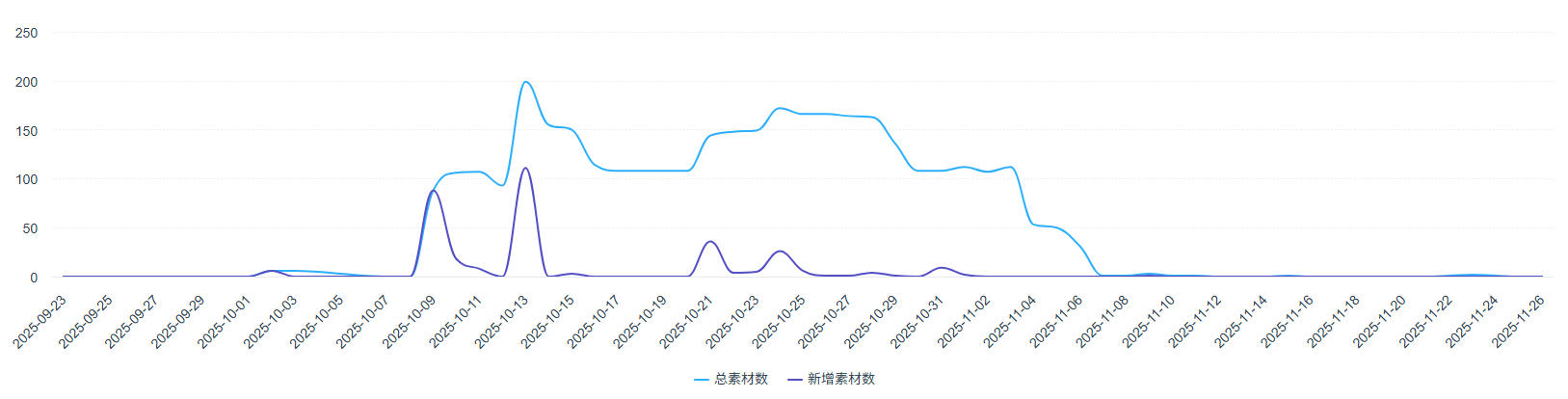 具体数据来看,《Micro Hunter》iOS端在投放力度上并不算特别大,单日投放素材量峰值出现在10月13日,接近200条。而从整个投放周期来看,《Micro Hunter》大约投放1100条创意素材。