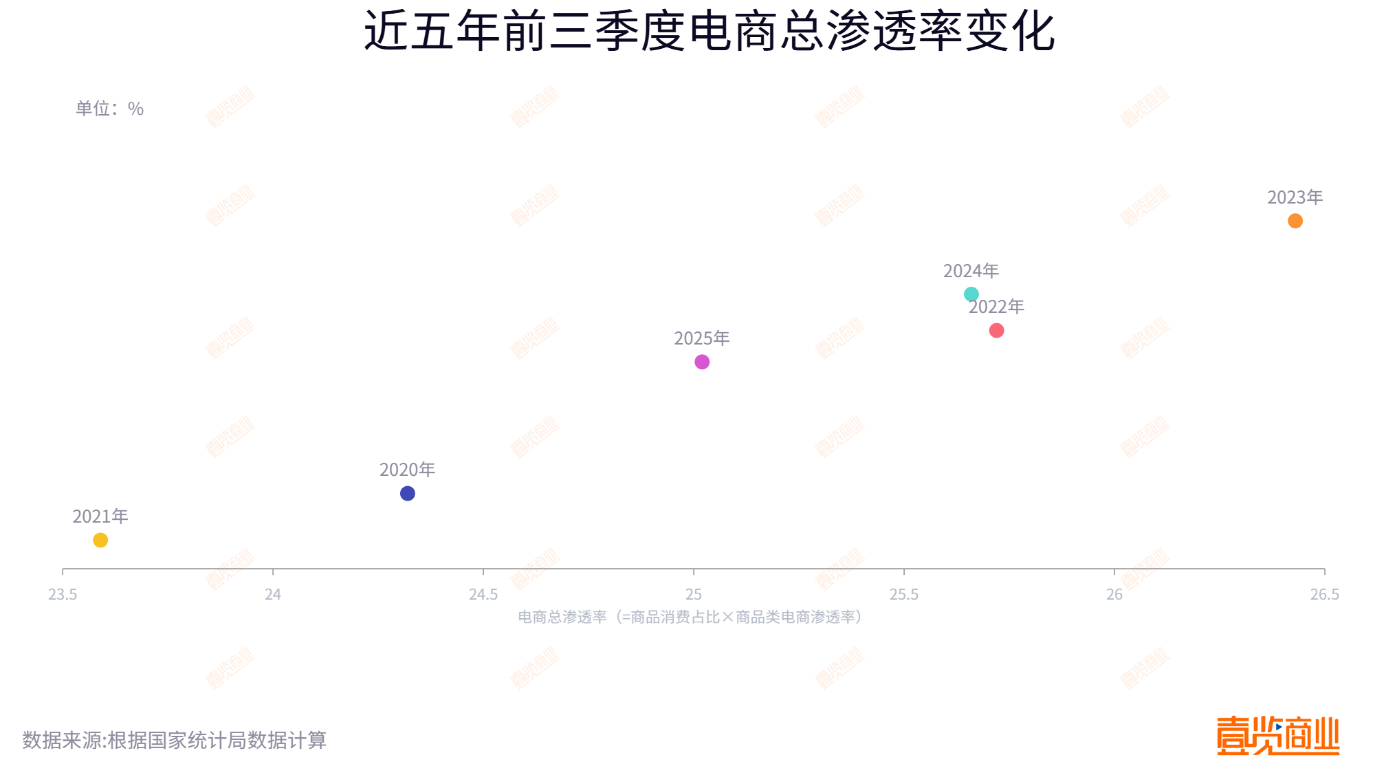 电商总渗透率在2023年达到顶峰后连续两年下滑,2025年降至25.02%,为近四年最低。这发出了一个再明确不过的信号:线上渠道的“天花板”就在眼前。