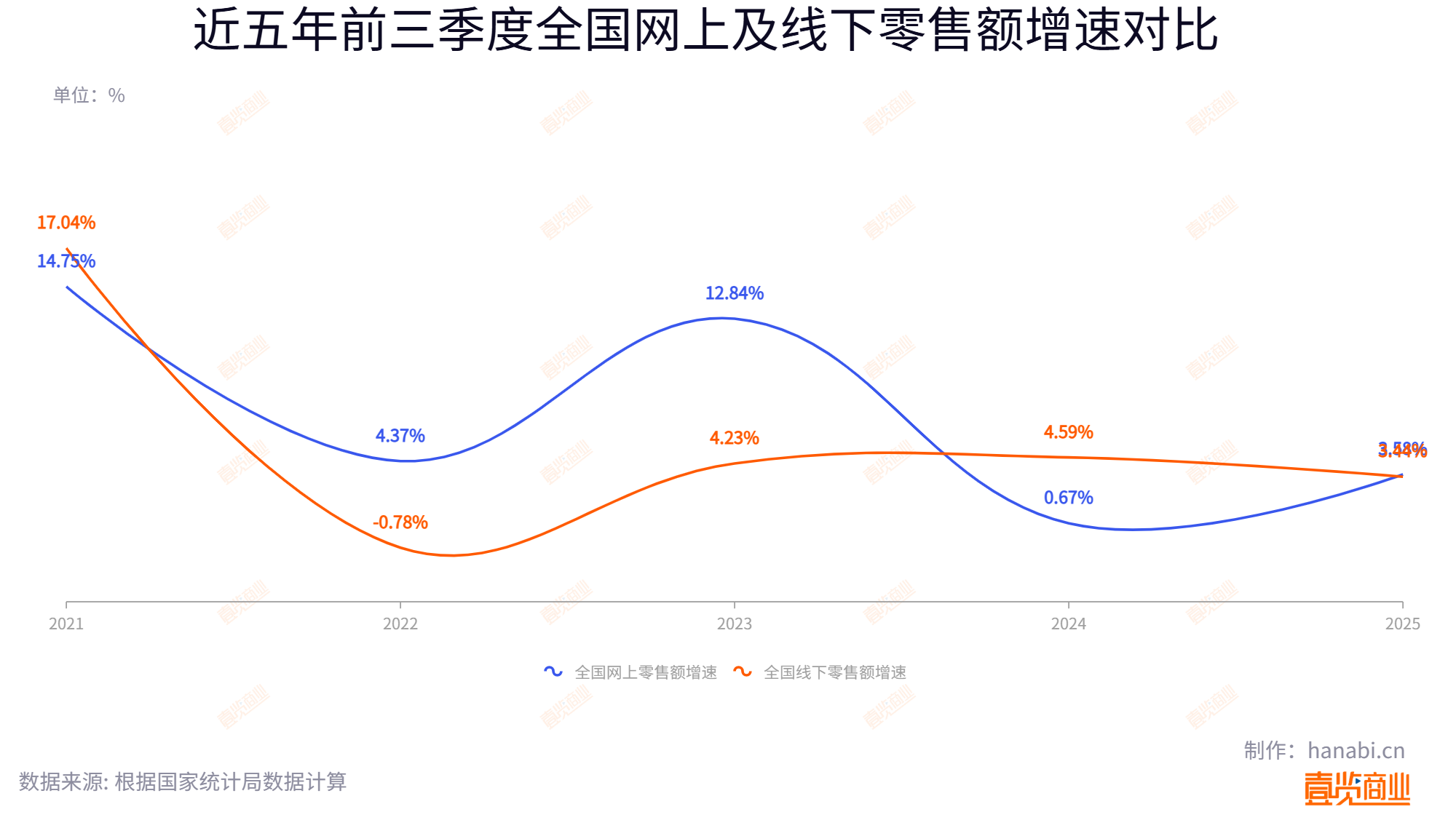 线上增速进入低增长新常态。国家统计局数据显示,全国网上零售额增速从2021年前三季度的14.75%一路下滑,2024年前三季度在零增长区间徘徊,尽管2025年前三季度小幅反弹至3.58%,但已进入个位数增长时代。