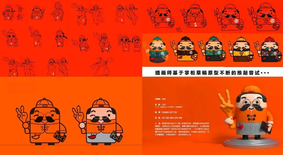 形象:圆墩墩的身体自带亲和力,小洋派服装展现时尚感,掌柜帽和眼镜传递专业感,手中的鸡爪和腰间的辣椒突出产品特色,算盘则象征着精打细算的经营理念