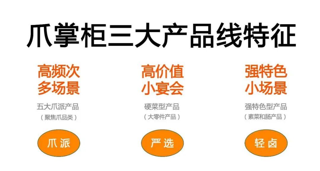 第二,产品线需要策略化,产品定位也需要响应爪派食尚轻卤开创者这一战略定位。因此,三大产品线需要满足三大场景需求。展开来说,爪派产品线需要满足高频次多场景,严选产品线需要满足高价值小宴会场景、轻卤派产品线需要满足强特色小场景。