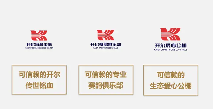 一方面宛如展翅飞翔的赛鸽,另一方面又完美传递出开尔品牌。梭形与翼型的结合,字体与标识完美融合统一,凸显其行业特点,向世界宣告“赛鸽就是开尔,开尔就是赛鸽”。