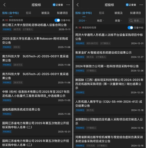 当然,宇树凭借中国具身智能头部地位,在B端市场还是拥有一大批客户的,保证了公司收入。从企查查的招投标数据中可以看到,其机器狗被广泛应用在电力巡检等领域;人形机器人则普遍用于科研,采购方多为高校和研究机构。