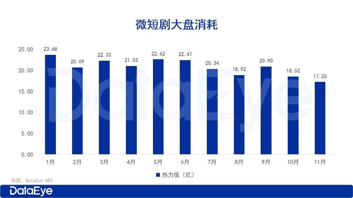 截至2025年11月,本年度微短剧大盘累计热力值为228.75亿,每月平均热力值为20.8亿。近几月,微短剧大盘呈收窄趋势。11月微短剧热力值达17.25亿,较上期下降约7%。