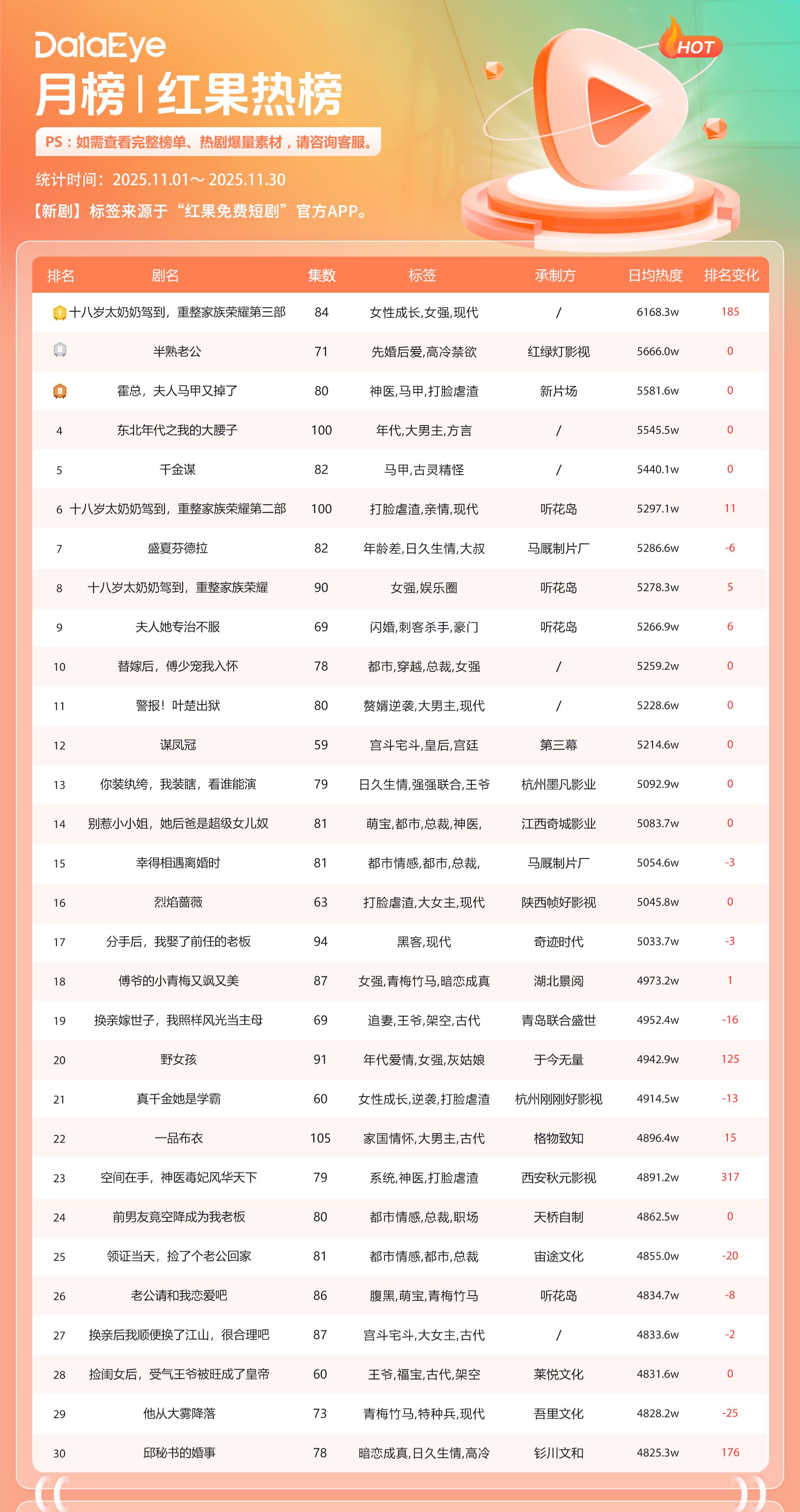 从热度来看,11月红果热榜月榜中,听花岛制作的《十八岁太奶奶驾到,重整家族荣耀第三部》第一,日均热度达6168.3W。《十八岁太奶奶驾到,重整家族荣耀第三部》10月26日上线,于10月28日登顶DataEye红果热榜日榜,热度达1.7亿。本期该剧持续霸榜,于11月1日达到本期热度峰值1.2亿。