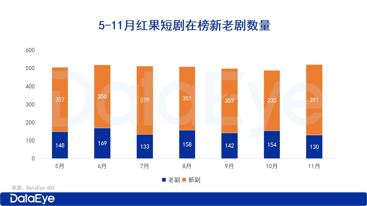 11月,红果短剧在榜剧达521部,数量达今年以来最高值,主要由于新剧数量的提升。本期新剧达391部,占比达75%,数量较上期提升56部。