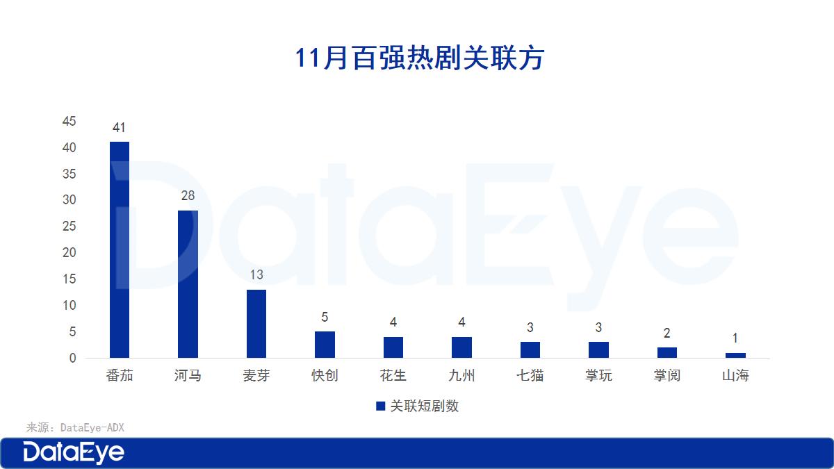 而从百强热剧的关联方来看,本期番茄、河马和麦芽稳居TOP3。番茄遥遥领先,占41席,接近半数份额,较上期下降7席;河马第二,占28席;麦芽位列第三,占13席;快创占5席,花生、九州各占4席。