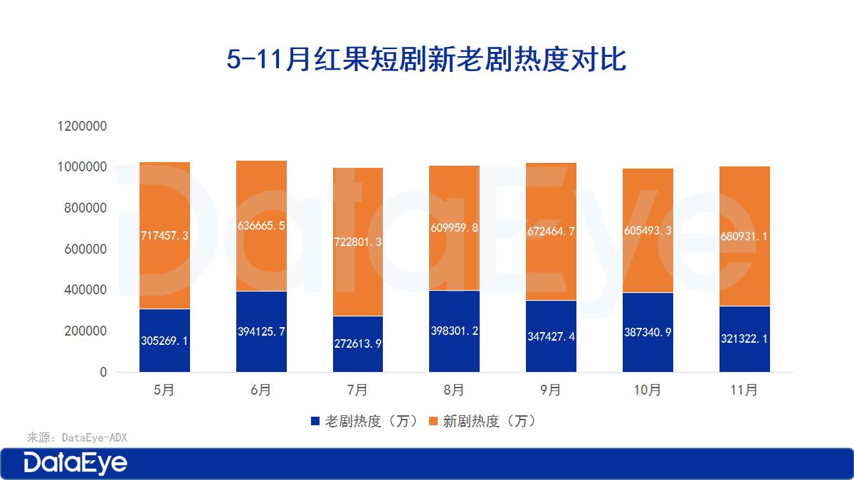 11月付费大盘热度有所下降,主要由于爆款率较上期有所下降,热度在中腰部的微短剧数量反而有所上升。同时百强热剧中新剧31%的涨幅也凸显了市场供给活力。
