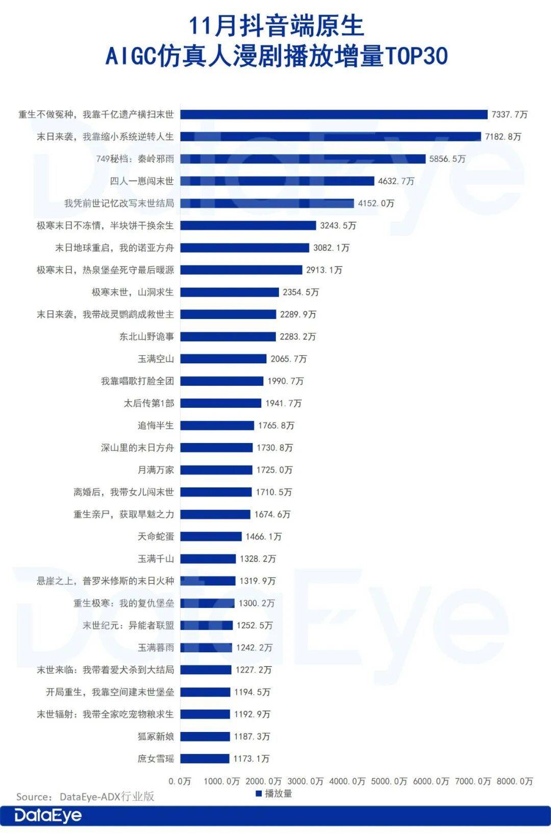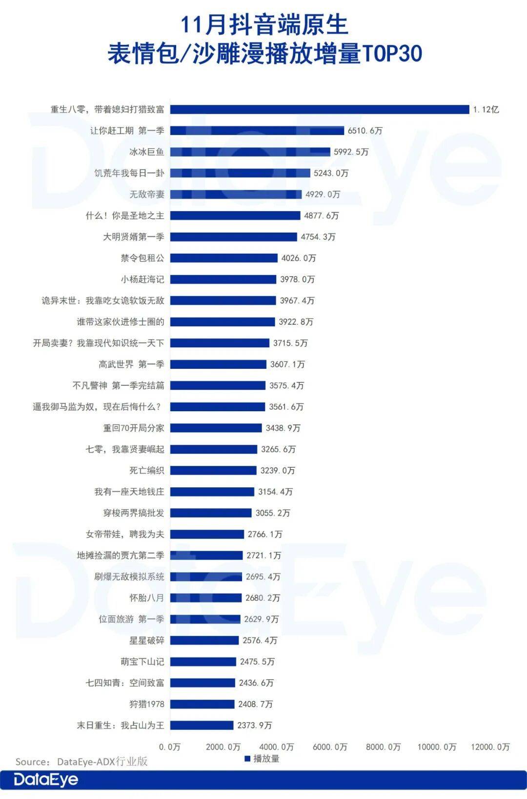 从11月抖音端原生漫剧的播放增量来看,总榜播放增量TOP1的是2D/3D漫剧《边关不用我守》,播放增量达1.62亿;播放增量最高的沙雕漫是《重生八零,带着媳妇打猎致富》,播放增量达1.62亿;播放增量最高的AI仿真人漫剧是《重生不做冤种,我靠千亿遗产横扫末世》,播放增量达7337.7万。