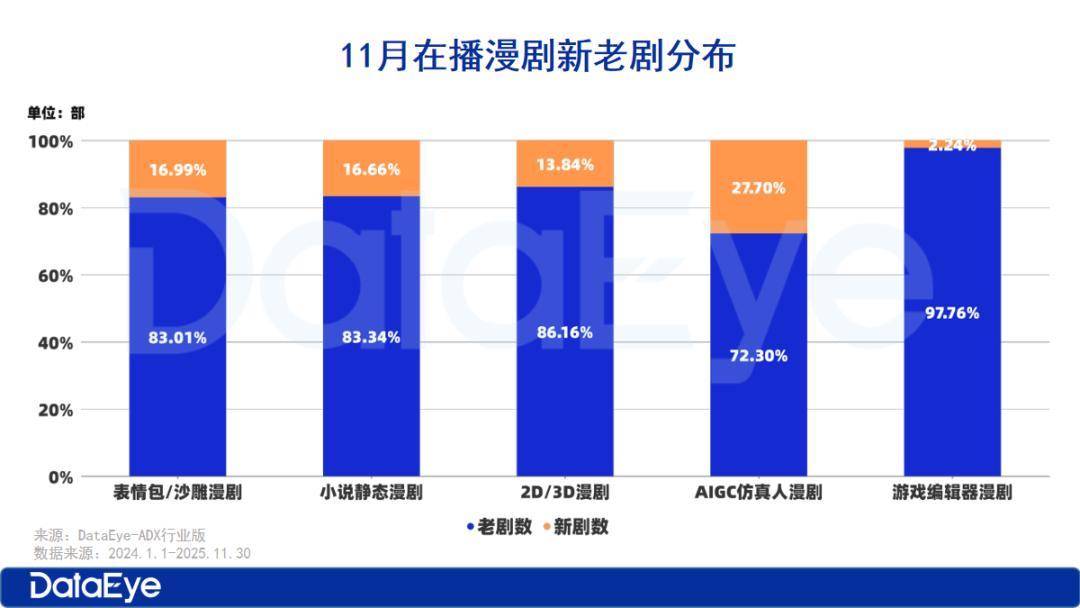 根据DataEye-ADX行业版数据显示,2025年11月依旧在播的漫剧总数达47329部(含2024年上线并持续在播剧目),市场供给充足。11月总体的播放增量达154.19亿,其中新上线剧的播放增量达56.82亿,占11月总体播放增量的36.85%。