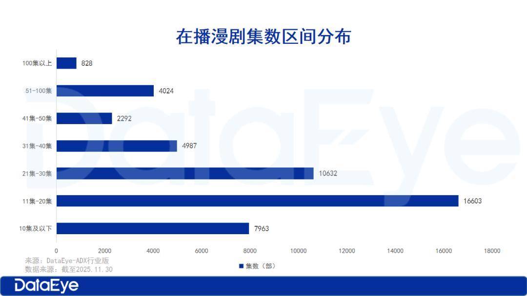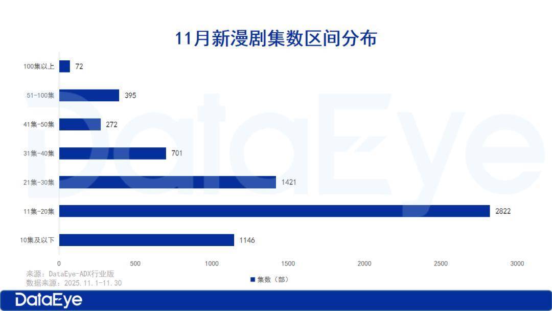 但单从11月新上线的漫剧来看,也是以20-40集的漫剧数量居多,共4944部,占比超70%。因此,DataEye短剧观察建议,漫剧厂商在制作漫剧时,可以考虑增加单剧时长,缩短单剧的更新周期来提高用户留存,也可以参考短剧的更新模式,一次全集上线,将单剧切分为3-5min的短剧集。