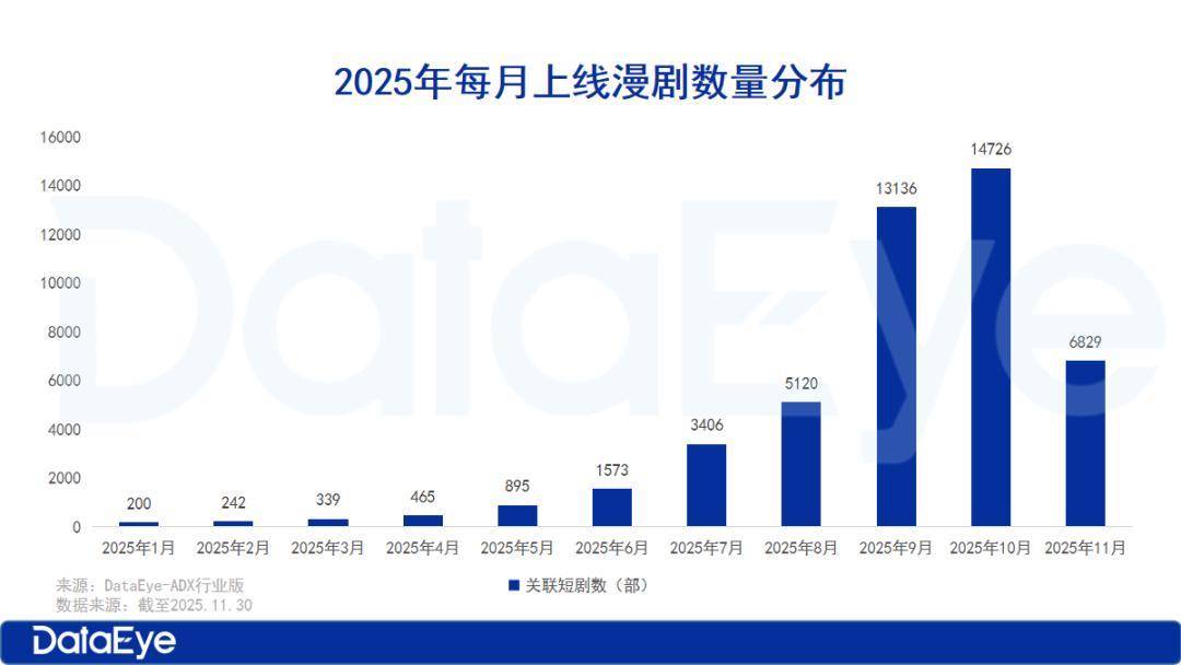 从月度数据看,9月上线了13136部,10月进一步攀升至14726部,9月和10月的漫剧上线量占全年在播漫剧总数的59.37%,创下年度峰值;但11月上线量大幅回落至6829部,较10月环比下降53.6%,出现显著的“上新腰斩”现象。