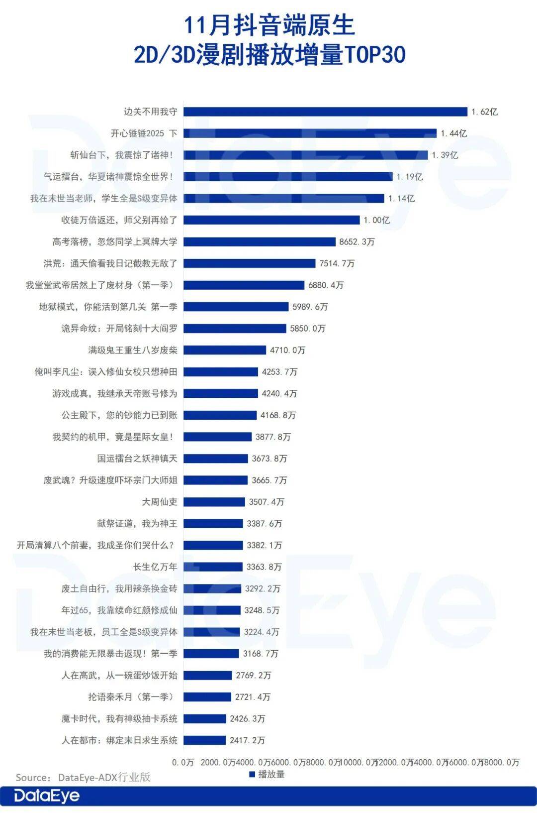 如11月热播漫剧中,播放增量TOP5的漫剧均为2D/3D漫剧,其中3部为新剧,新剧《边关不用我守》11月播放增量更是达到1.62亿。