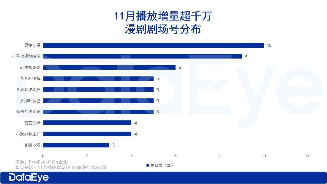 而从11月的新剧播放增量来看,播放增量大于1000W的新剧中,“小星动漫放映室”剧场号占7席,主要为播出的漫剧类型为2D/3D漫剧。其次是“AI漫影说剧”剧场号占6席,“九九Ai漫解”剧场号占3席,位列第三,两个剧场号播出的内容均为AIGC仿真人漫剧。