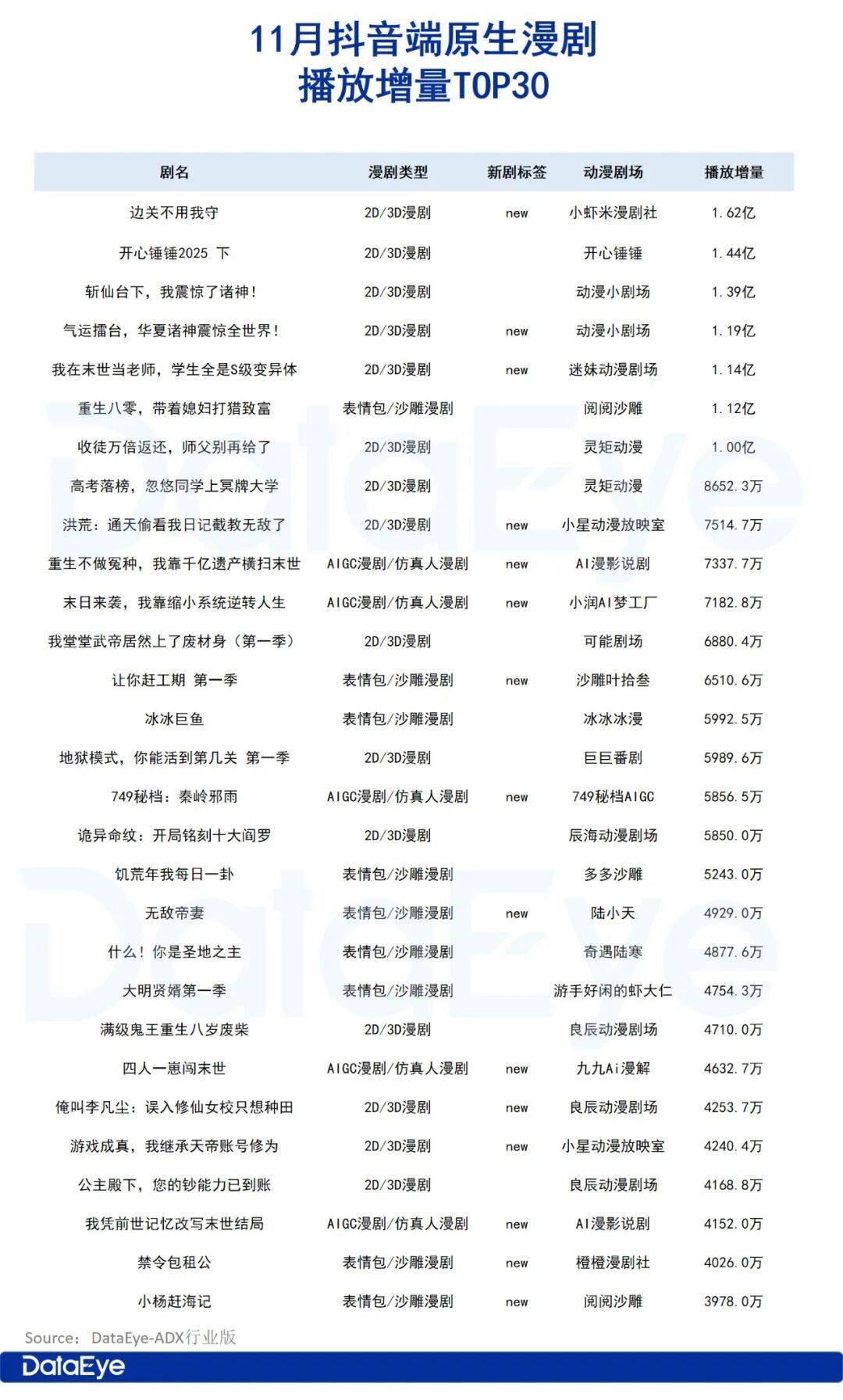 综合来看,2D/3D 漫剧是当前抖音漫剧市场的 “流量天花板”,占据绝对主导,11月播放增量前5名均为该类型,且 TOP30的漫剧中占18席。说明,高制作精度支撑的题材表现力,能更好承接大流量;同时,DataEye短剧观察认为,11月新平台审核后,精品化的2D/3D作品将更易获得流量倾斜,进一步放大了头部作品的优势。