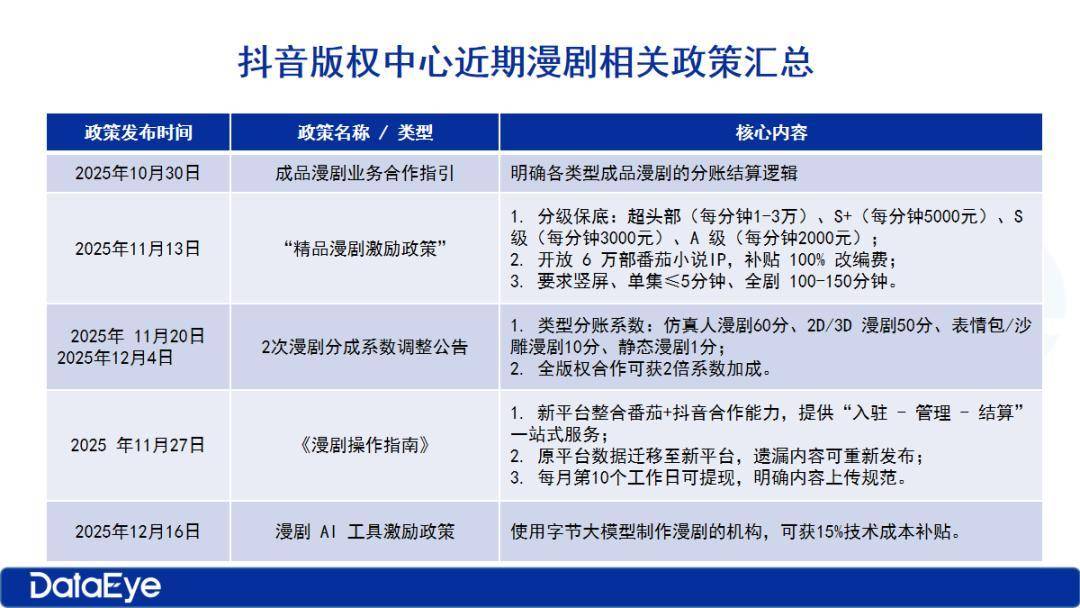 近期抖音短剧版权中心出台一系列针对漫剧的相关政策,近期,抖音版权中心及红果发布相关政策汇总如下: