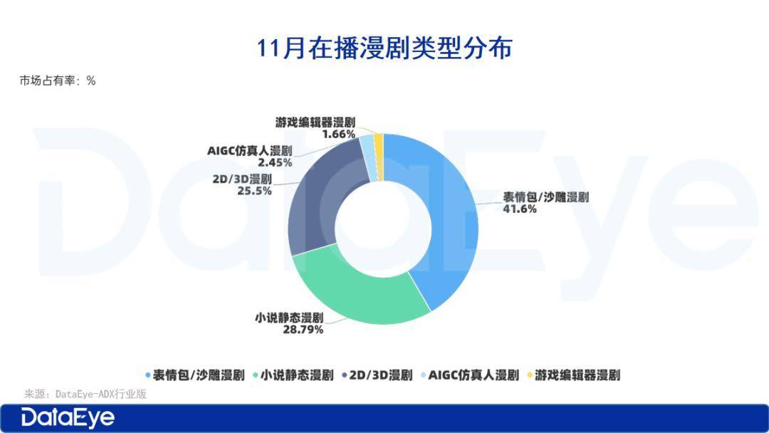 其次是小说静态漫剧占比达28.79%,2D/3D漫剧占比达25.5%。