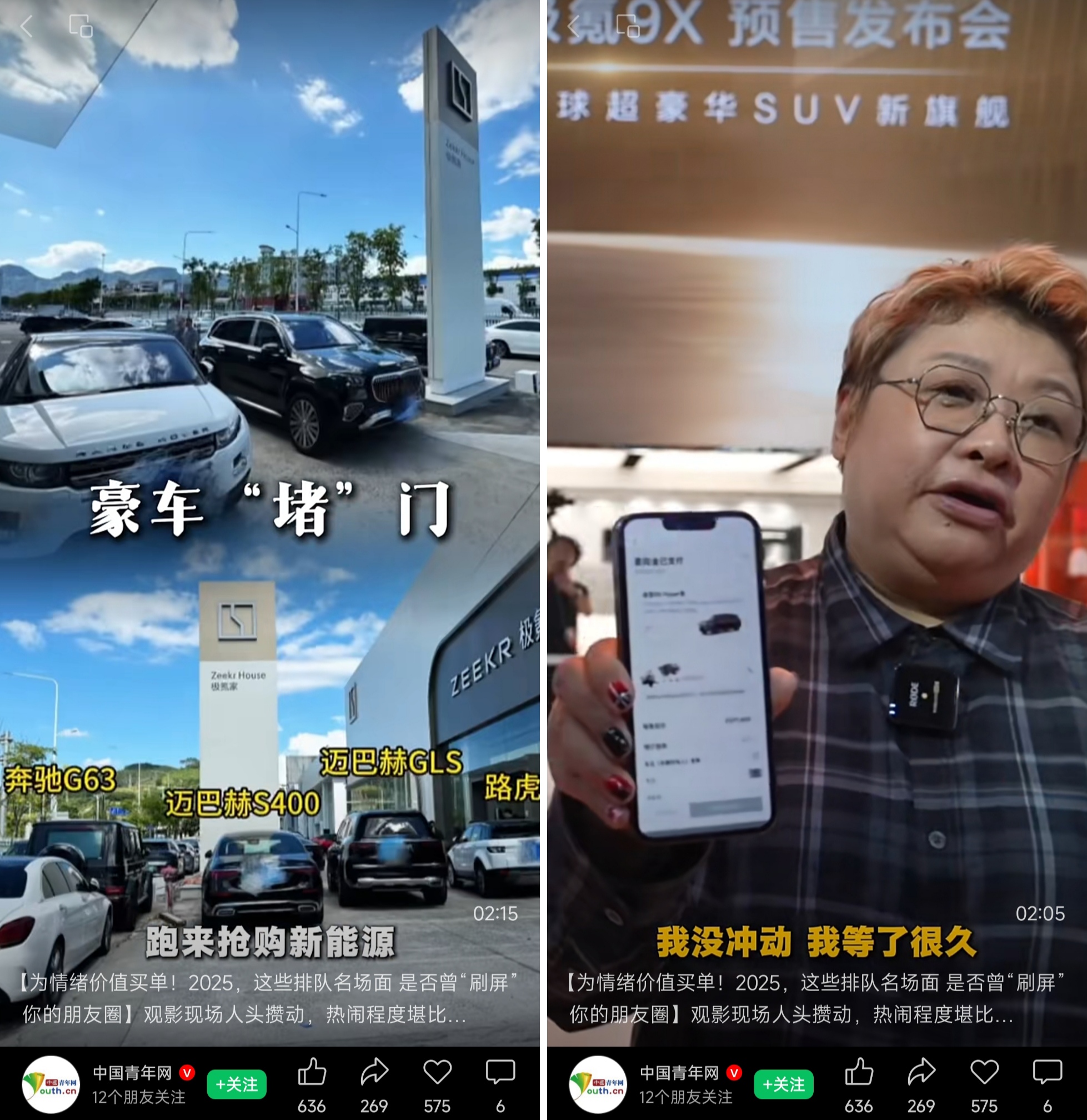 2025年末,中国青年网发布了“年度排队消费名场面”盘点视频,其中汽车消费场景罕见入围:极氪汽车门店前豪车云集,孙红雷、韩红等明星车主排队提车,卡塔尔大使现场下单极氪9X,甚至引发40国驻华使节集体品鉴。