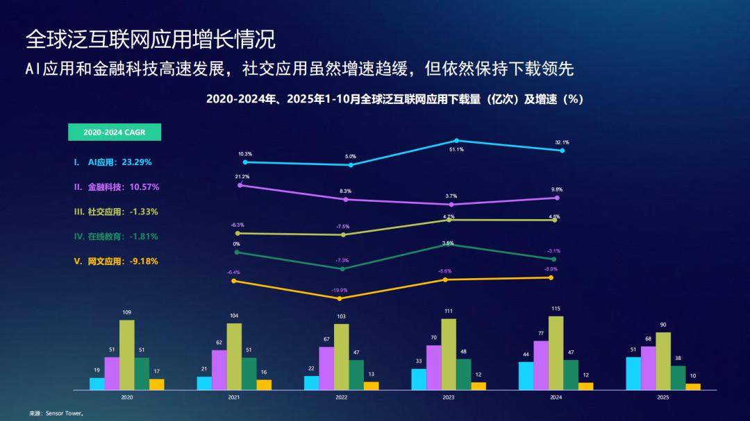 各类互联网应用从下载量来看,除短剧外,AI应用增速最快。短短5年时间,AI应用的下载量从与社交应用相差5倍,逐渐缩小到2倍以内。