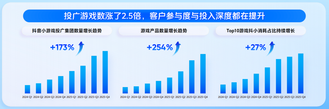 抖音小游戏生态各项核心数据均呈现爆发式增长态势。其中,流水规模增长100%、日活跃用户(DAU)同比增长120%、达人供给增长350%、小游戏占抖音时长比例增长75%。