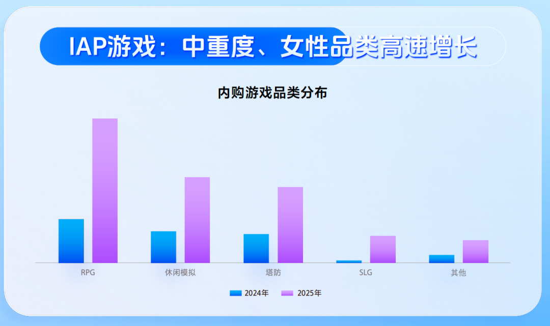 大会现场透露的信息显示,今年抖音IAP小游戏中,RPG、休闲模拟、塔防、SLG四类游戏实现快速增长,成为IAP赛道的核心驱动力,整体呈现出多元化发展格局。