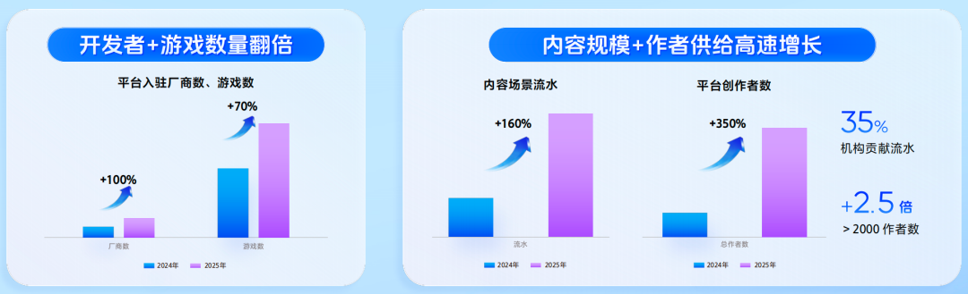 今年抖音小游戏入驻厂商数、游戏数都在稳步提升,前者增长100%,后者增长约70%;同时,内容规模以及作者供给也在持续增长,内容场景流水增长160%,平台创作者数增长350%。