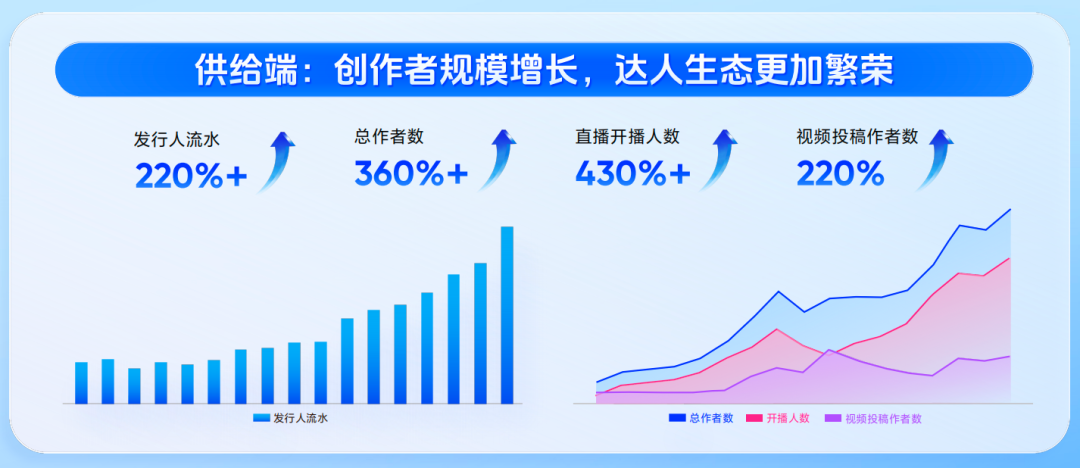 此外,在供给侧发行人流水增长220%,总作者数增长360%。整体呈现规模增长趋势,达人生态更加繁荣。