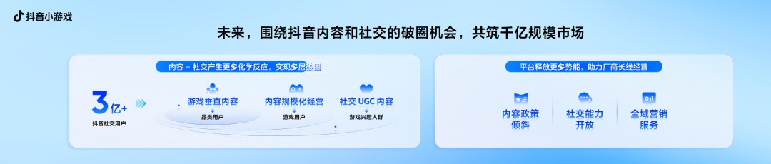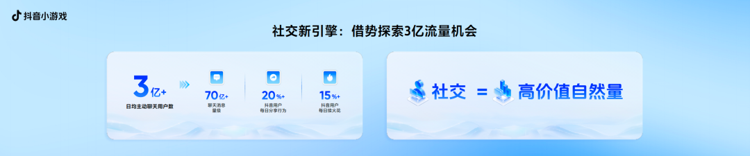 林克表示,「内容+社交」双引擎,是抖音小游戏规模化的增长新动力:抖音生态的核心优势在于强大的内容分发能力与社交连接能力,小游戏的增长逻辑应是“以内容为入口完成用户积累,再以社交裂变为抓手实现规模扩张”。