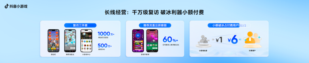 在复访入口和长期经营上,目前抖音小游戏侧边栏日启动超过1000万,直玩DAU达到500万。付费层面,小额破冰用户占付费用户约1/3,成为平衡体验与商业化的重要手段。