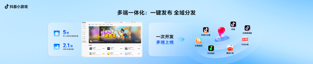 同时,围绕“一个包体,全域分发”的生态扩容方向,平台强调了一次开发、多端上线的分发效率,以及PC端带来的价值放大效应。结合抖音、抖音极速版、今日头条、皮皮虾、番茄小说、红果短剧、抖音火山版等多个分发阵地,小游戏不再被局限在单一场景中。
