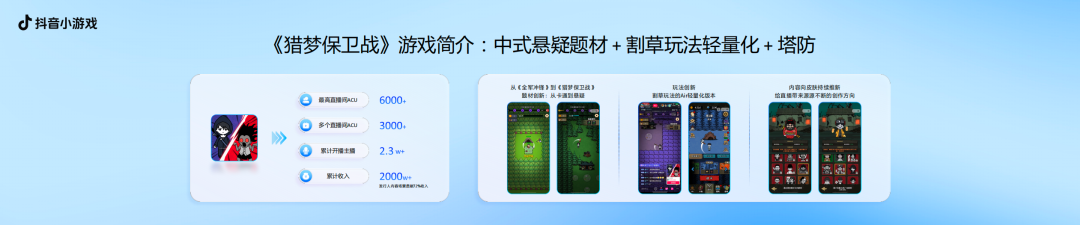 同时,易磊也分享到,题材是一方面,直播内容也是促进抖音小游戏快速增长的重要一环。如《猎梦保卫战》在直播场景中跑出了稳定规模,最高直播间ACU超过6000,累计开播人数23000+,累计收入2000万+。