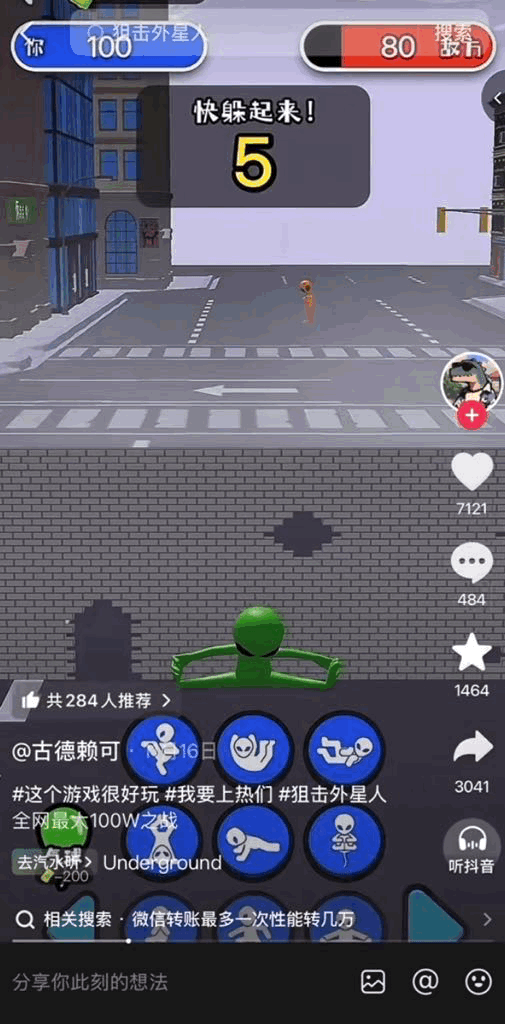 其一:魔性、搞怪式的内容视频。游戏中「外星人」可以摆出各类魔性搞怪的躲避动作,既增加了游戏的趣味性,也迎合了当下年轻人对于特性类内容的需求。
