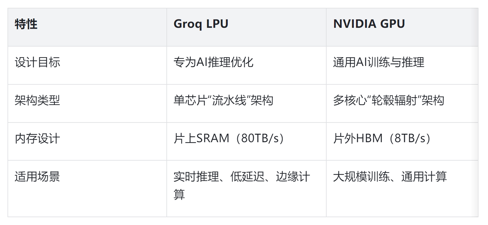 GPU擅长“并行计算”,能将复杂任务分解为数千个可同时执行的小计算,适合大规模模型训练;而LPU擅长“流水线计算”,数据依次经过处理单元,无冗余传输,适合低延迟、高吞吐量的推理任务。