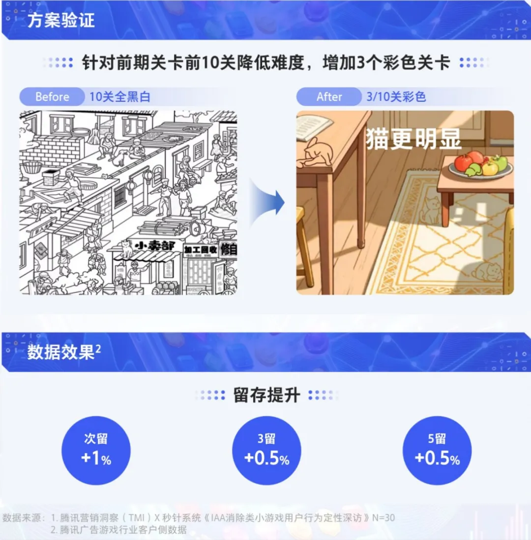 腾讯广告IAA游戏峰会上提到的消除类小游戏《找个喵》案例,正是这一趋势的典型体现。通过对用户行为与反馈的深入调研,团队发现新手阶段采用的全黑白画面关卡设计,虽然在美术风格上具有统一性,但却在实际体验中显著提高了用户的理解与操作成本。尤其是在初期关卡中,消除目标不够突出,导致新用户需要额外思考“应该消什么”“下一步做什么”,无形中拉高了流失风险。