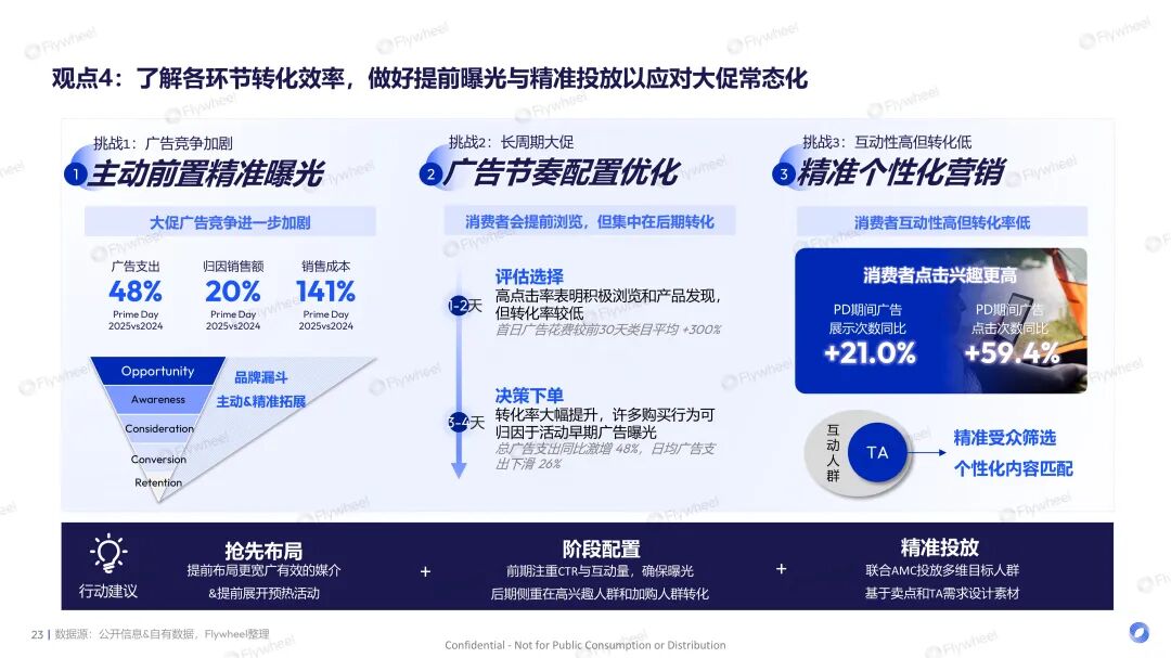 品牌需摆脱过去依赖短期冲量的粗放模式,转向以数据驱动、贯穿用户全旅程的运营,如借助AMC工具投放等。此外,在预热期,品牌要提前通过核心渠道进行预热曝光;在大促前期关注CTR与互动量变化;在大促后期则更侧重于高兴趣人群和加购人群的转化等,从而更好地把握大促窗口。