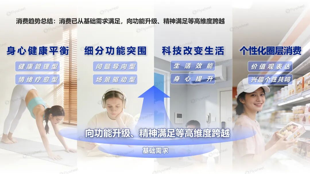 消费趋势从满足基础需求向功能升级、精神满足等高维度跨越,身心健康平衡、细分功能突围、生活健康科技与个性化圈层认同成为四大消费驱动力。