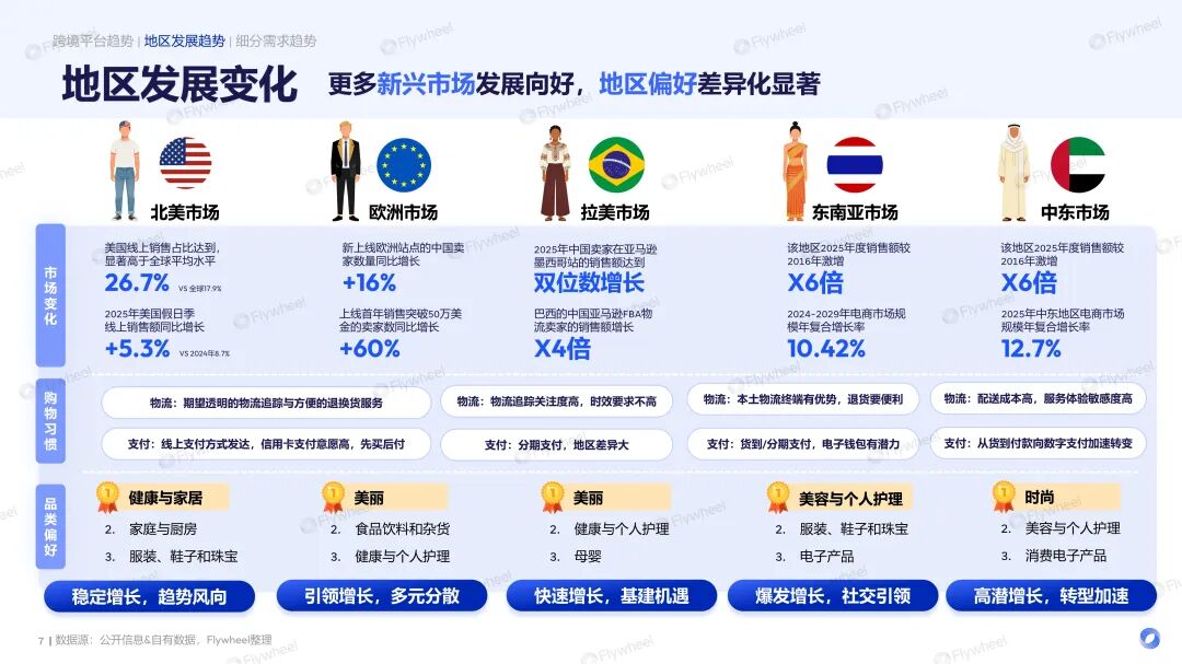 在平台和独立站的协同发力下,不同地区差异化的市场表现与消费偏好得以进一步呈现。北美、欧洲市场展现出极高的市场成熟度,而拉美、东南亚、中东等新兴市场凭借基建红利、社交电商等因素崛起,实现了跃迁式增长。
