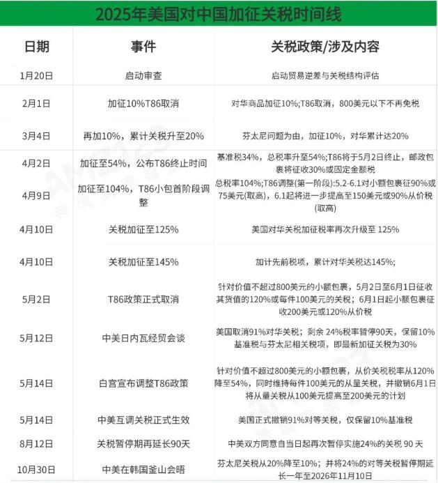 1月,特朗普借“芬太尼问题”对中国商品加征10%关税;3月,美国以中国拒绝取消报复性关税为由,对中国征收20%全面关税和34%对等关税;4月,美国进一步将中国商品关税额外提高50%至84%,最终一路提高至145%。