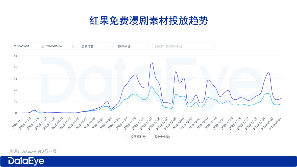 ADX行业版数据显示,11月下旬后,红果免费漫剧日投放素材数保持在1000+组,日均投放计划数也能维持在2000组上下。